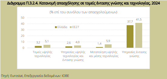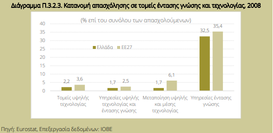 Ακόμη πιο αποκαλυπτική είναι η εικόνα στους τομείς έντασης γνώσης και τεχνολογίας. Το 2008, η Ελλάδα υστερούσε σε όλες τις κατηγορίες: στους τομείς υψηλής τεχνολογίας μόλις 2,2% έναντι 3,6% στην ΕΕ-27, στις υπηρεσίες υψηλής τεχνολογίας και έντασης γνώσης 1,7% έναντι 2,5%, στη μεταποίηση υψηλής και μέσης τεχνολογίας 1,7% έναντι 6,1%, και στις υπηρεσίες έντασης γνώσης 32,5% έναντι 35,4%.