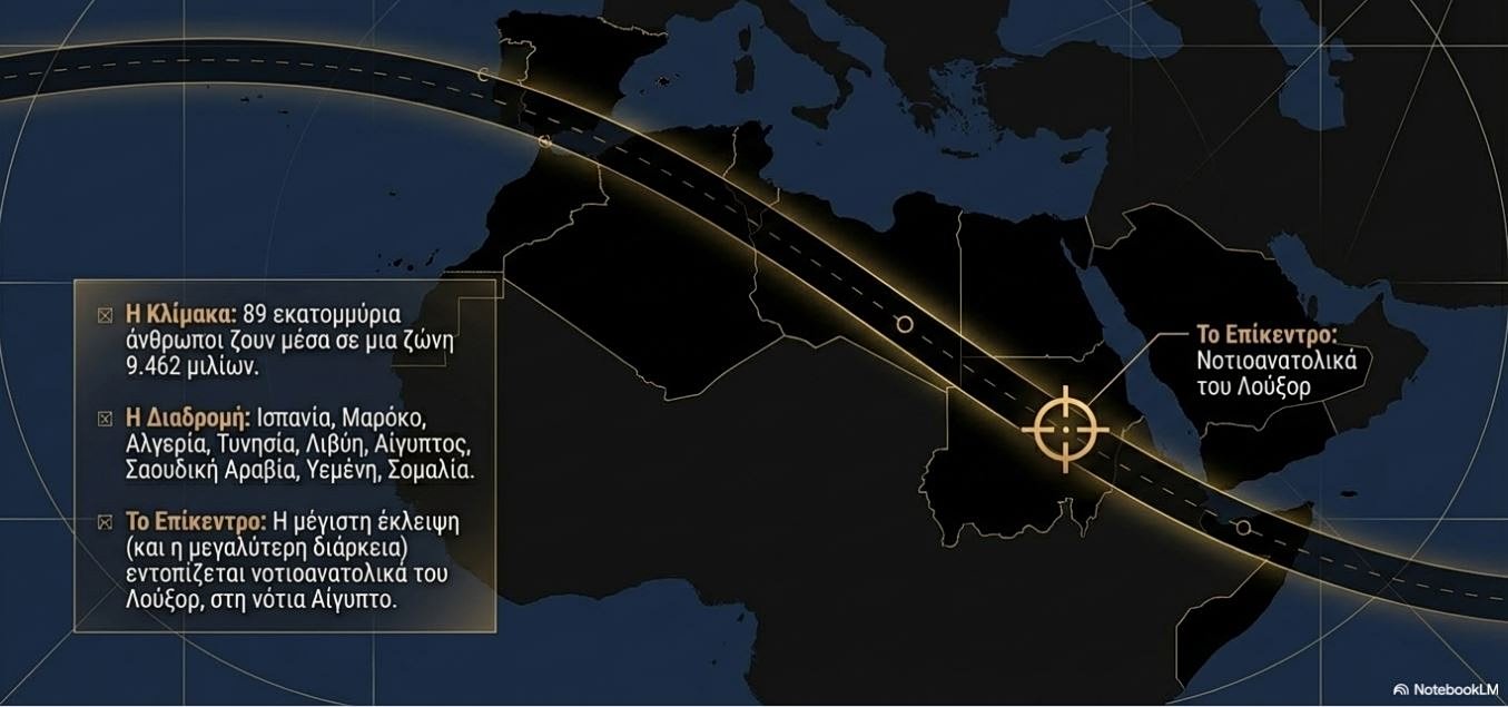 Η σπάνια αυτή ευθυγράμμιση θα καλύψει με σκοτάδι περιοχές της Βόρειας Αφρικής, της Μέσης Ανατολής και της νότιας Ισπανίας, προσφέροντας πάνω από έξι λεπτά παρατήρησης του φαινομένου