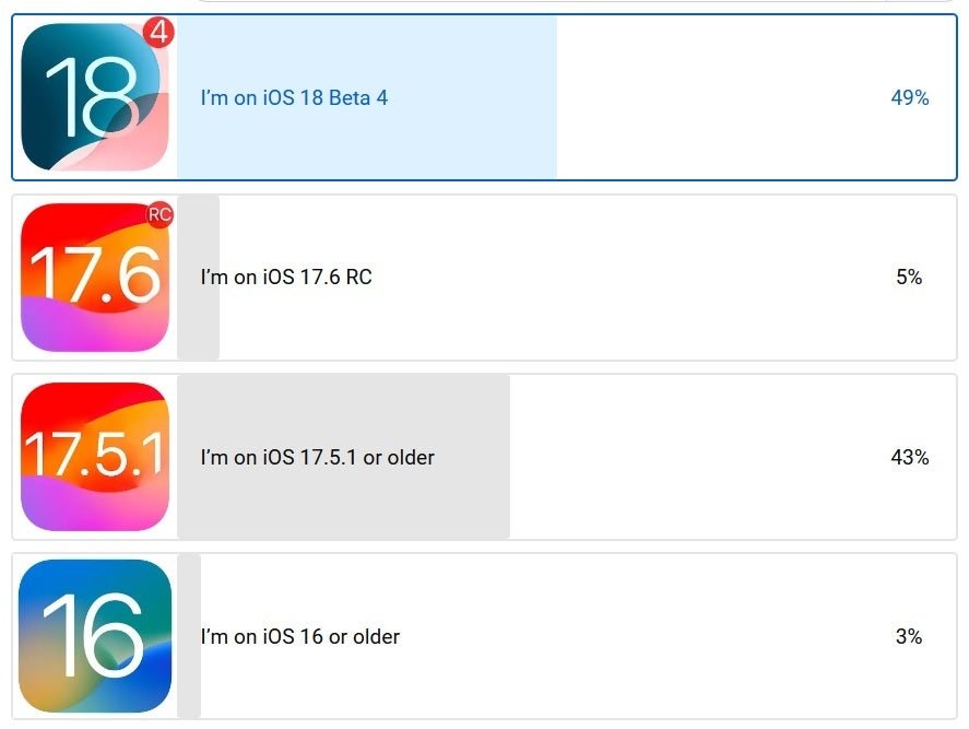 Έχοντας αυτό υπόψη, προκαλεί έκπληξη το γεγονός ότι η δημοσκόπηση δείχνει ότι το κορυφαίο 49% των ερωτηθέντων έχει κατεβάσει το iOS Developer Beta 18 στα iPhone τους. Η τελευταία σταθερή έκδοση του λειτουργικού συστήματος του iPhone, iOS 17 .5.1, είναι η επόμενη. Το 43% των κατόχων iPhone που απάντησαν στη δημοσκόπηση είπαν ότι αυτή είναι η έκδοση του iOS που εγκατέστησαν τελευταία. Με την κυκλοφορία του iPhone 17.6 RC την περασμένη εβδομάδα, η Apple θα κυκλοφορήσει την επόμενη σταθερή έκδοση iOS πιθανότατα αυτή τη Δευτέρα.