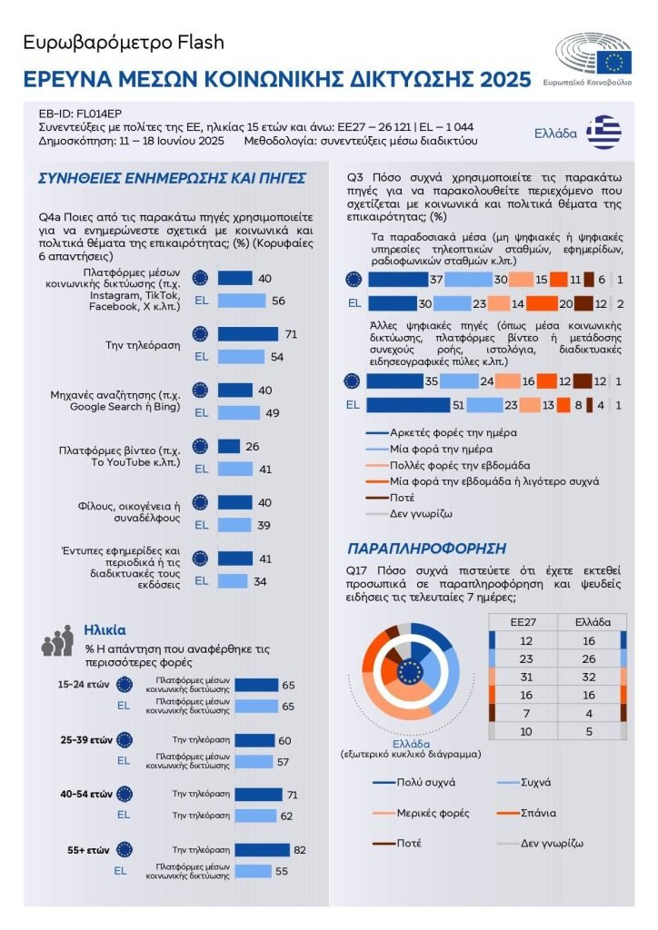 Στην Ελλάδα, το 56% των πολιτών δηλώνει ότι ενημερώνεται κυρίως μέσω των μέσων κοινωνικής δικτύωσης, σύμφωνα με την έρευνα «Social Media 2025» που δημοσίευσε το Ευρωπαϊκό Κοινοβούλιο.
