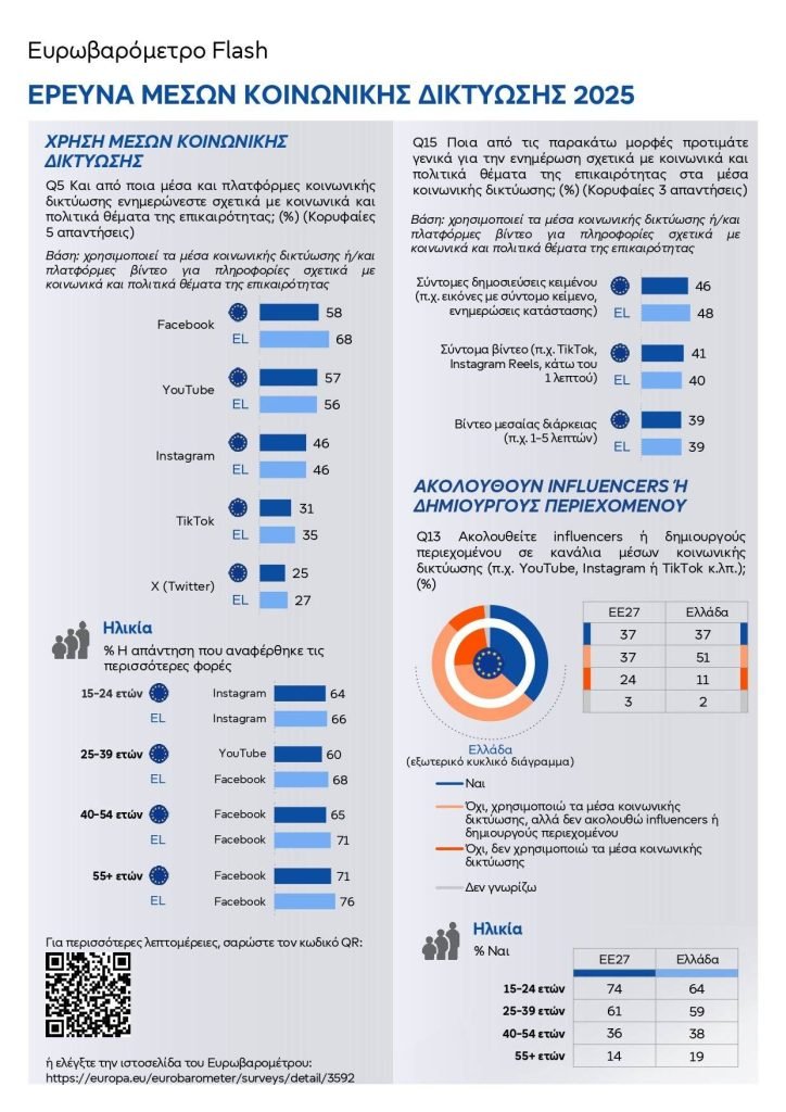 - Στην Ελλάδα, το 68% δηλώνει το Facebook ως πηγή ενημέρωσης (σε σύγκριση με 58% στην Ε.Ε.), ενώ στους νέους 15-24 ετών η πρώτη επιλογή είναι το Instagram (66%, έναντι 64% στην Ε.Ε.).